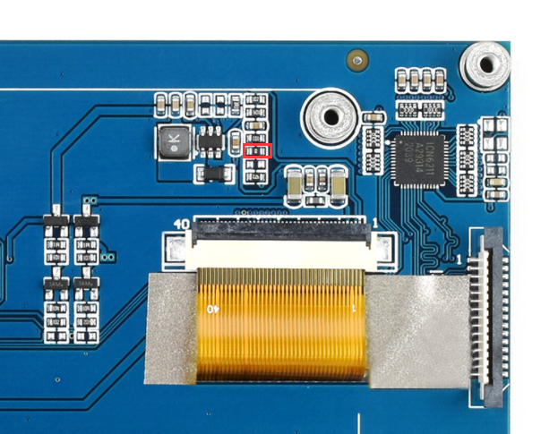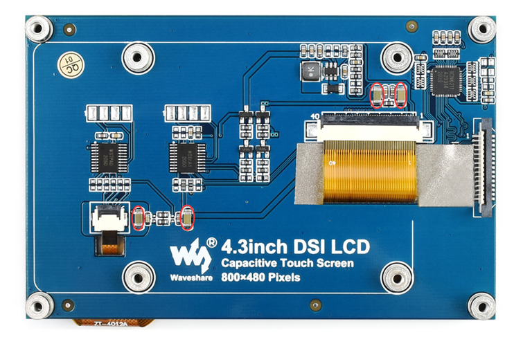2. 若您是之前购买的产品,如Rev2.1版本(或者更老),由于Pi5的电源检测机制,其对DSI LCD上的电容识别为假性短路状态,从而没有启动系统。 对于此情况,您可以手动去掉以下四个位置的大电容(如下图红圈位置):