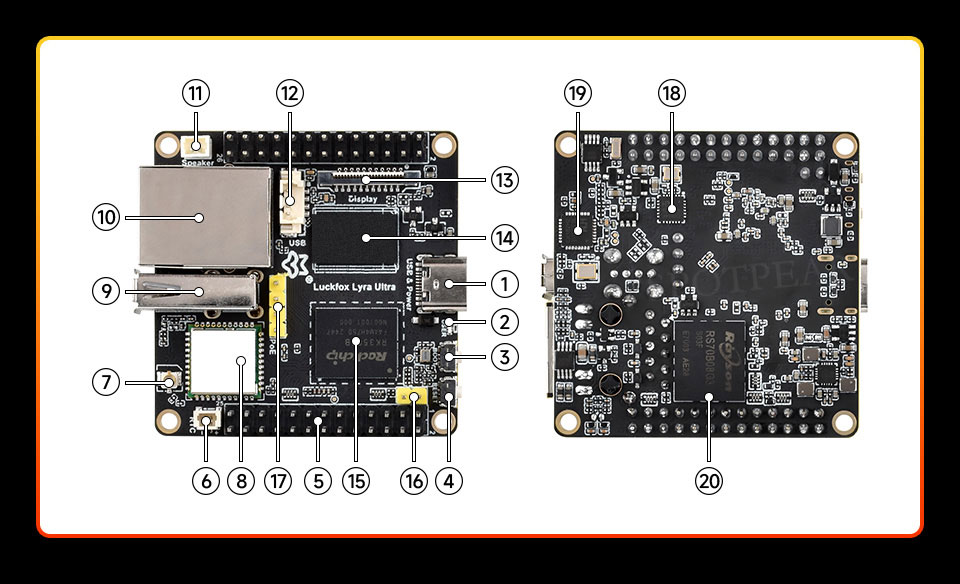 • 低速接口采用瑞芯微的 Rockchip Matrix IO 设计,可以让丰富的复用功能共享有限的芯片引脚,让外围电路适配更加灵活