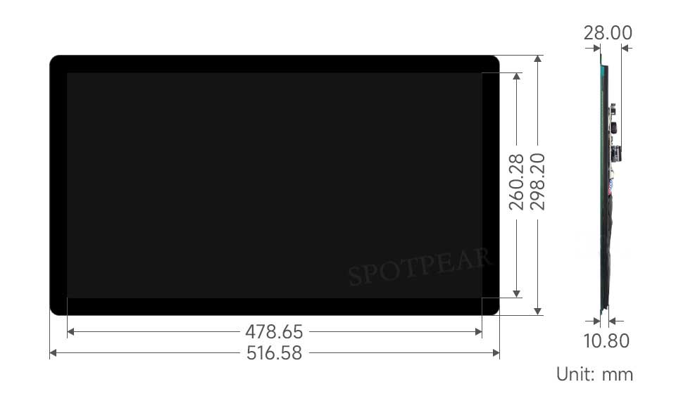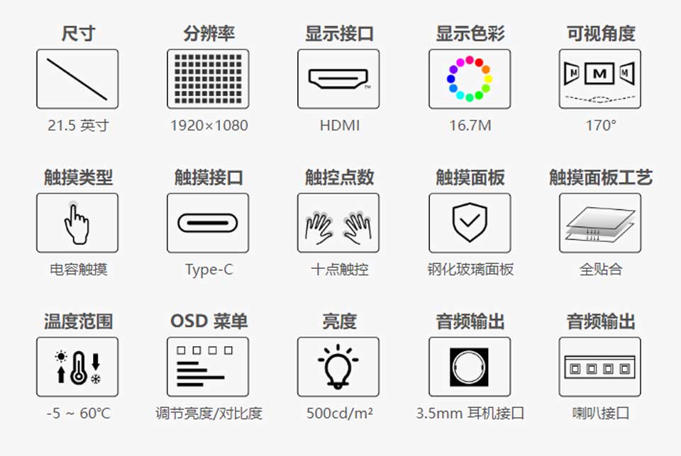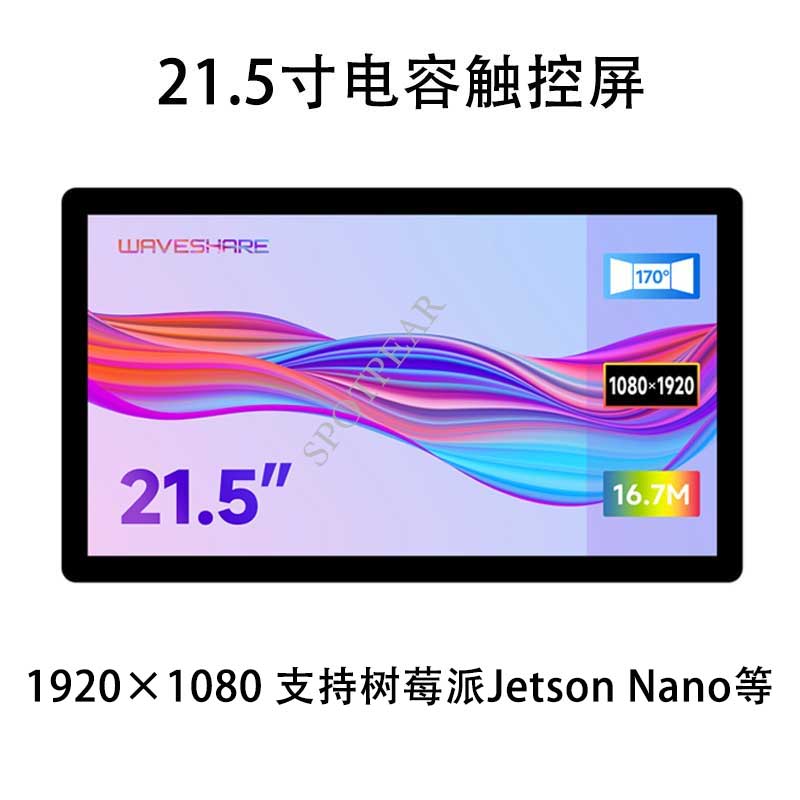 21.5 英寸电容式触摸显示屏,1920×1080 全高清,光学粘合钢化玻璃面板,支持 Raspberry Pi/Jetson Nano 等。