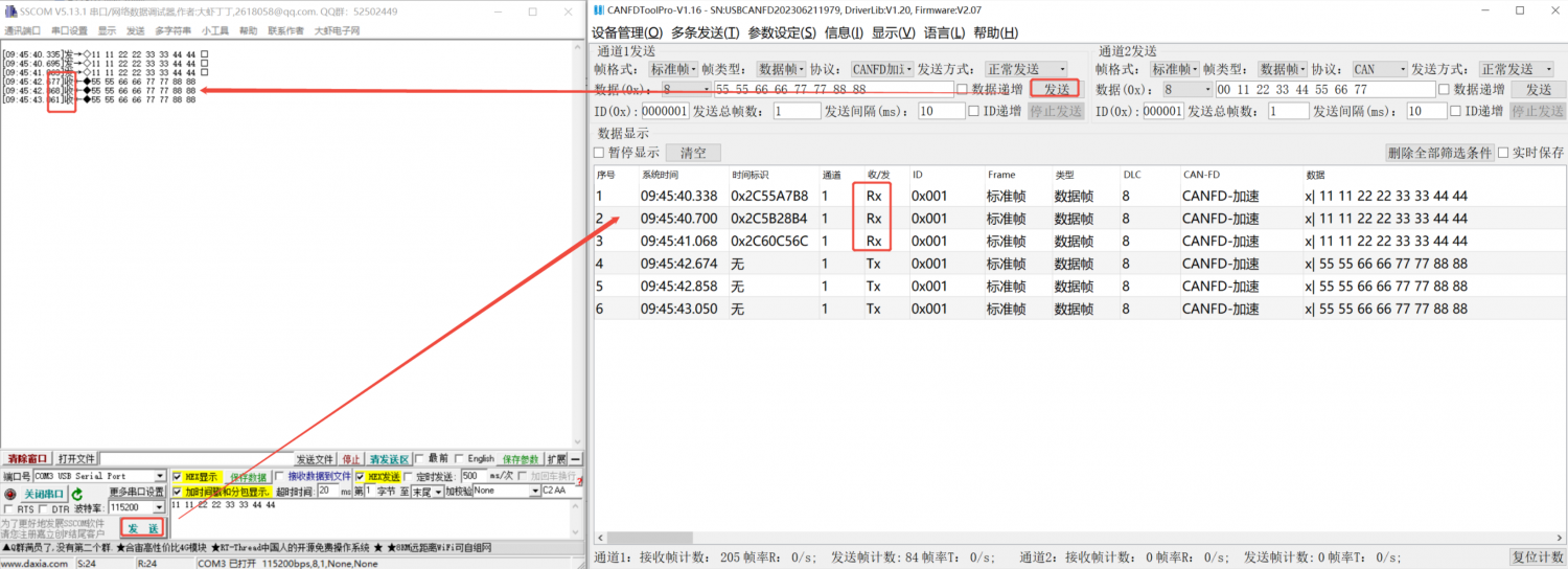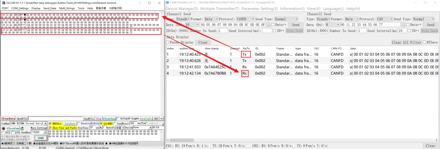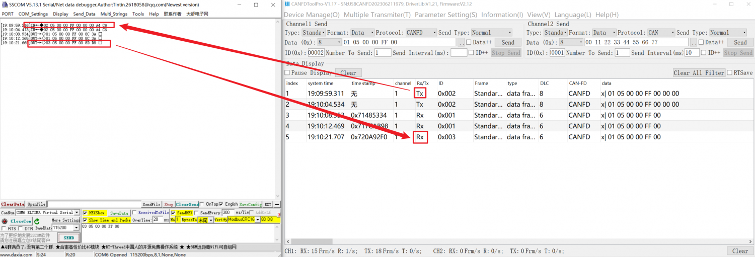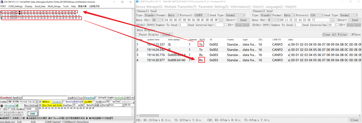 3、CAN FD ETH RS232/RS485 Converter 的 RS232-TX 接 USB TO RS232 (B) 的 RS232-RX