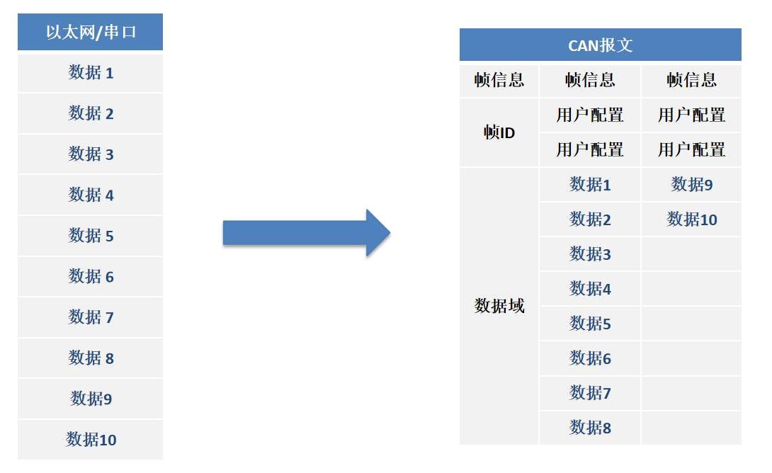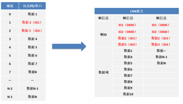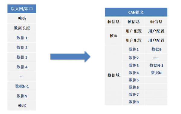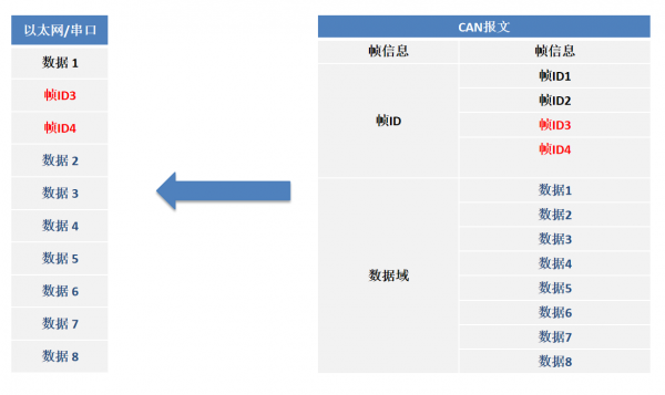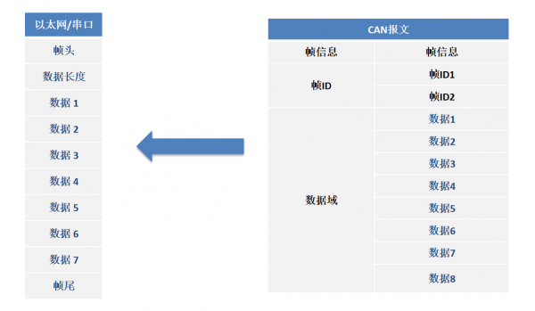 为了让用户方便使用 CAN-bus,将串行帧/以太网帧格式向 CAN 帧格式靠拢,在串行帧/以太网帧中规定了一帧的起始及结束,即“帧头”和“帧尾”,用户可自行配置。