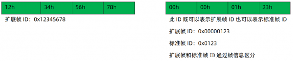 帧ID:长度4字节;高位在前,低位在后。标准帧有效位是 11 位,扩展帧有效位是 29 位。