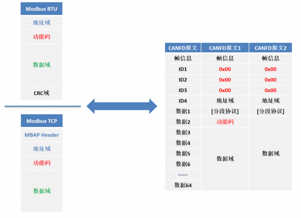转换的是 Modbus 的协议内容——功能码和数据域,转换时将它们依次转换在 CAN 报文帧的数据域(从第二个数据字节开始,第一个数据字节为分段协议使用)里。 由于 Modbus 帧的长度根据功能码的不同而不同,而 CAN 报文一帧只能传送 7 个数据,CANFD 报文一帧只能传送 63 个数据。 所以转换器会将较长的 Modbus 帧分段转换成 CAN 的报文后,用上述的 CAN 分段协议发出。用户在 CAN的节点上接收时取功能码和数据域处理即可。