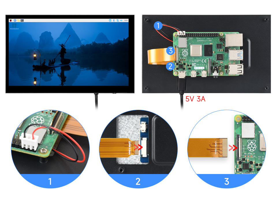注意:请确保 DSI 排线方向连接无误,并通过 GPIO 引脚提供 5V 电源。
