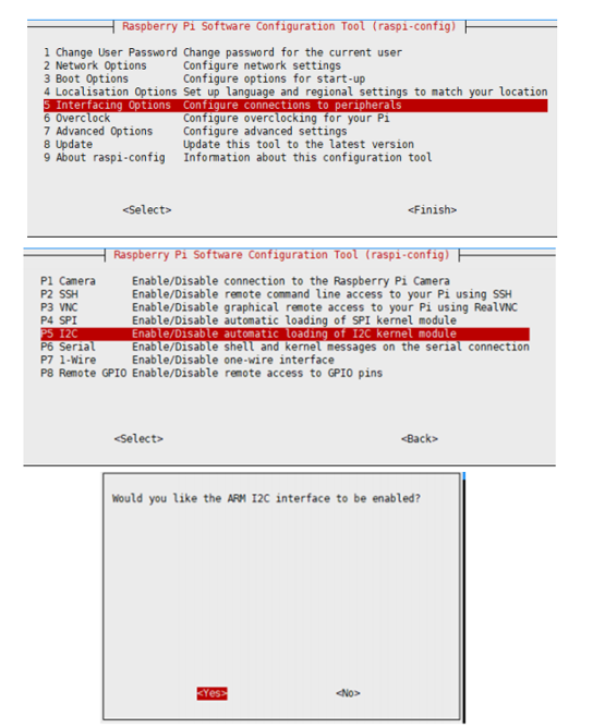 选择 Interfacing Options -> I2C ->yes 启动 i2C 内核驱动