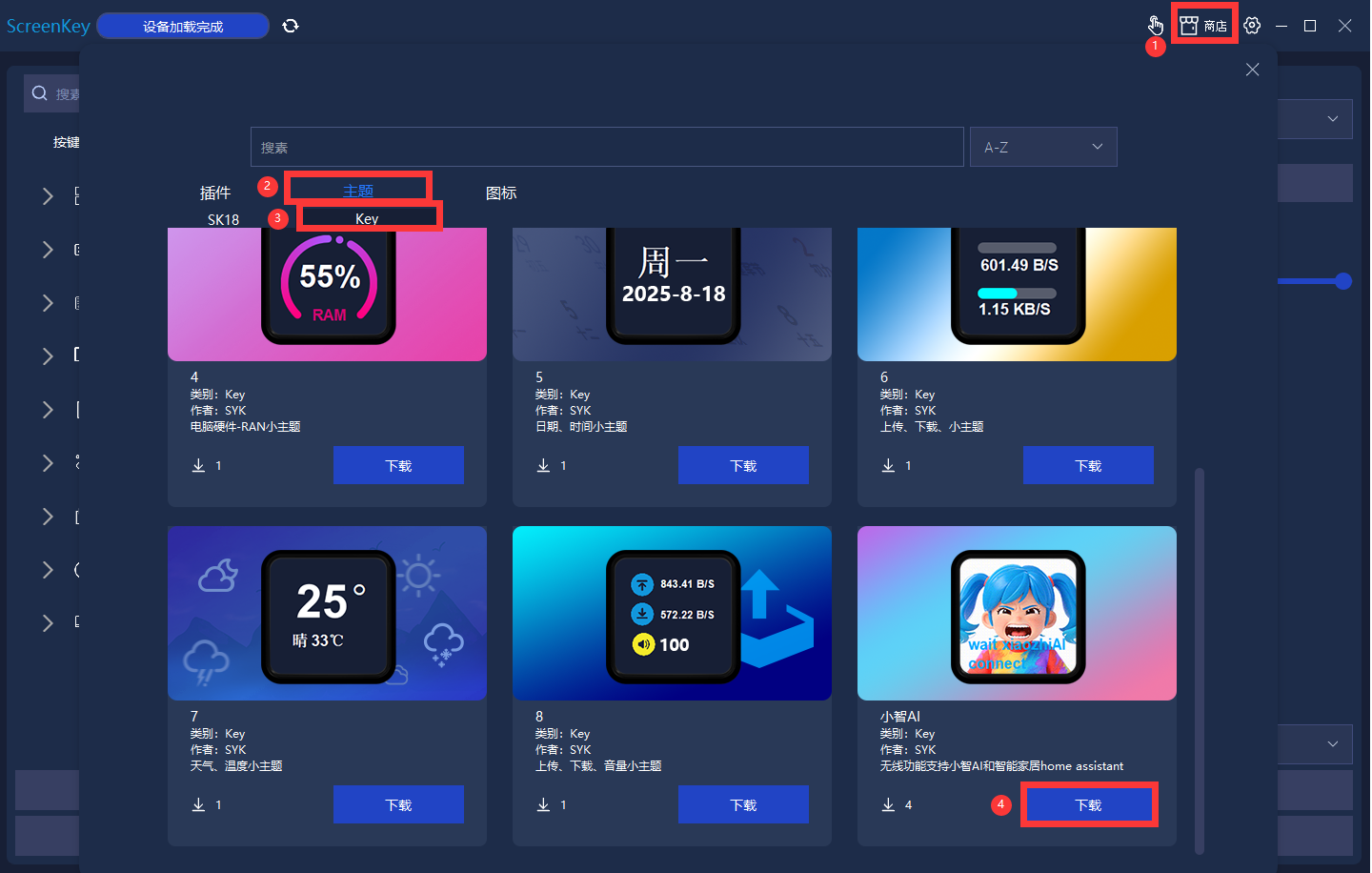 ① 在软件中进入商店,搜索并下载 Key -小智AI 。