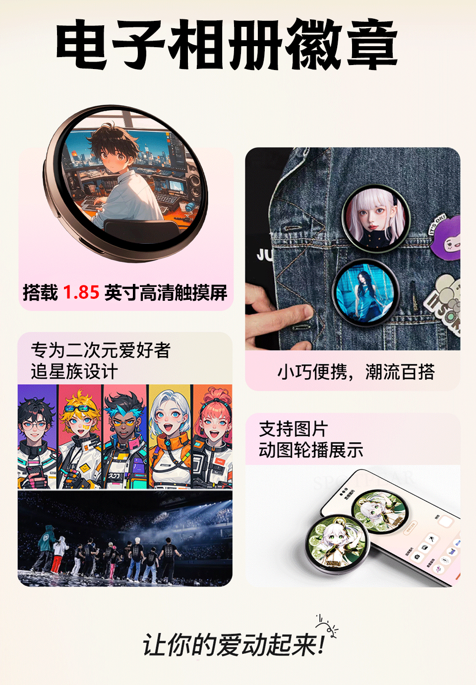 电子吧唧1.85寸LCD显示屏带喇叭演唱会应援漫展胸针