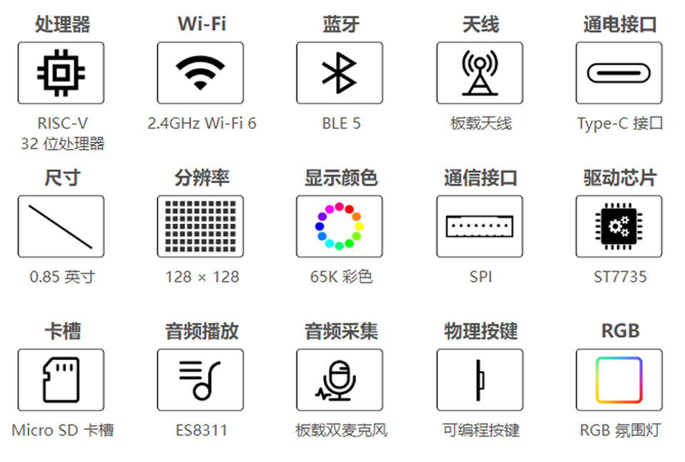 • 板载 0.85 英寸 LCD 屏,128 × 128 分辨率,65K 彩色