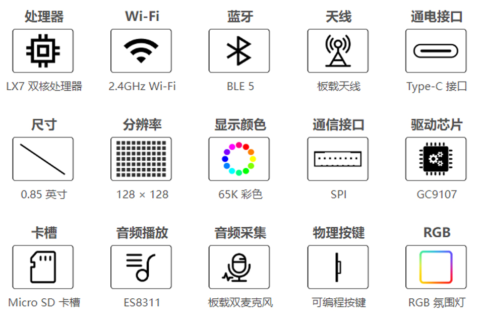 | 显示分辨率 | 128 × 128 像素 | 显示颜色 | 65K |