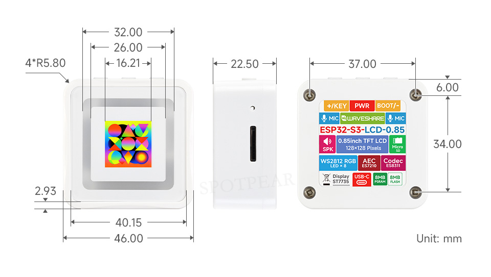 ESP32-S3-LCD-0.85 是一款支持 2.4GHz Wi-Fi 和蓝牙 BLE 5 的微控制器开发板,采用小方盒开模塑料外壳,小巧美观且质感出众。板载 0.85 英寸 IPS 彩色 LCD 显示屏、Micro SD 卡槽、8 颗 RGB 炫彩灯及低功耗音频编解码芯片等外设,方便开发多媒体与交互应用。凭借这些硬件资源,产品可实现图像显示、音频播放和灯效控制等功能,既适合快速原型开发,也可嵌入终端产品进行个性化扩展和二次开发。