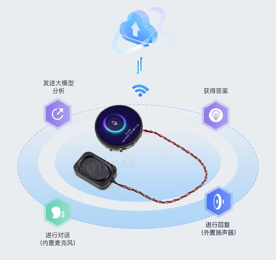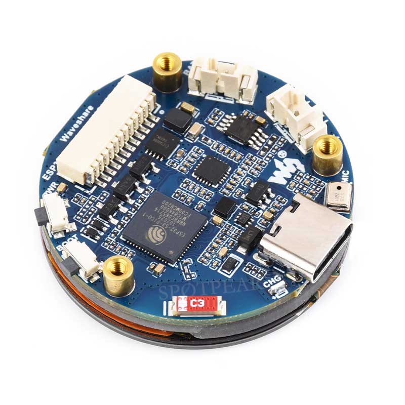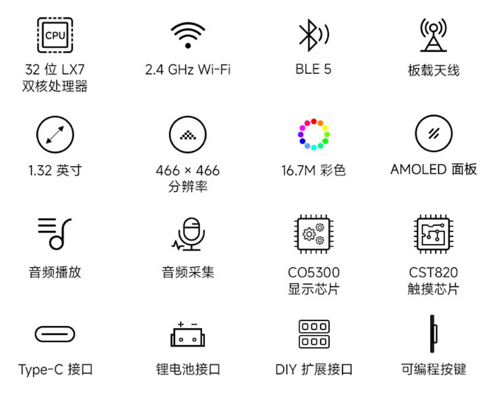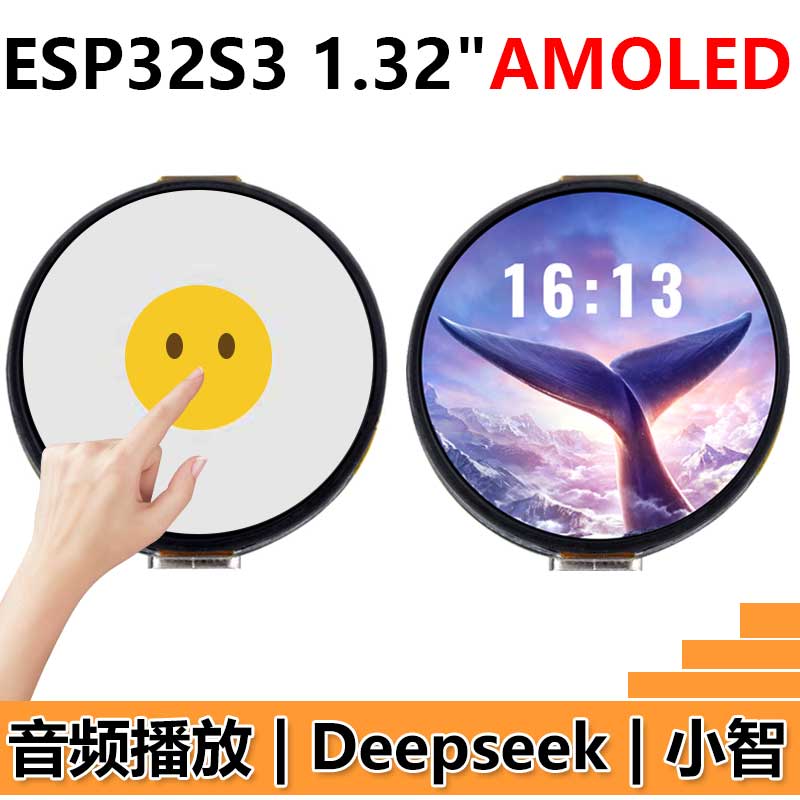 本产品由微雪 (Waveshare) 设计,在紧凑的板型中集成了 1.32 英寸电容式高清 AMOLED 屏、电源管理模块、低功耗音频编解码电路及麦克风,并引出了 12PIN 扩展 IO 接口、锂电池接口和喇叭接口,可用于 AI 语音智能体等应用场景。