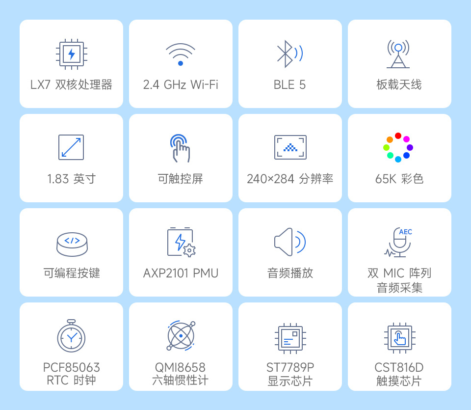 支持 2.4GHz Wi-Fi (802.11 b/g/n) 和 Bluetooth 5 (LE)