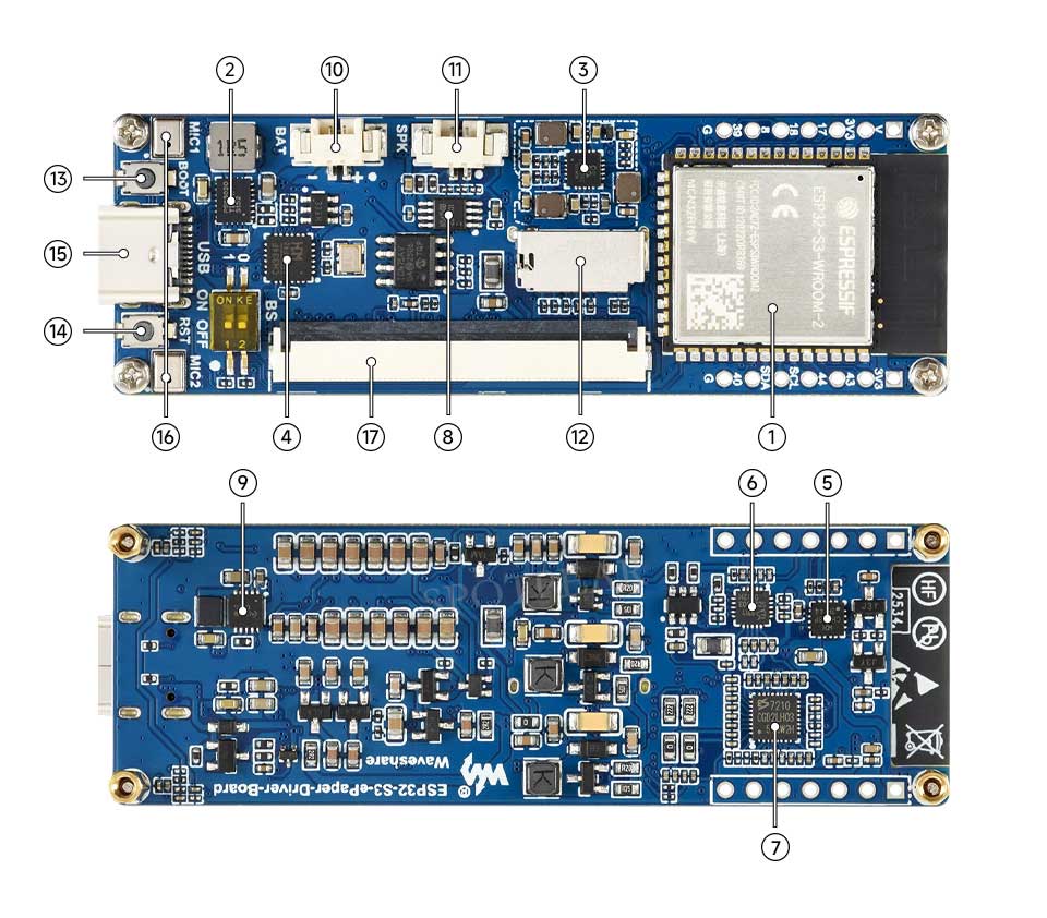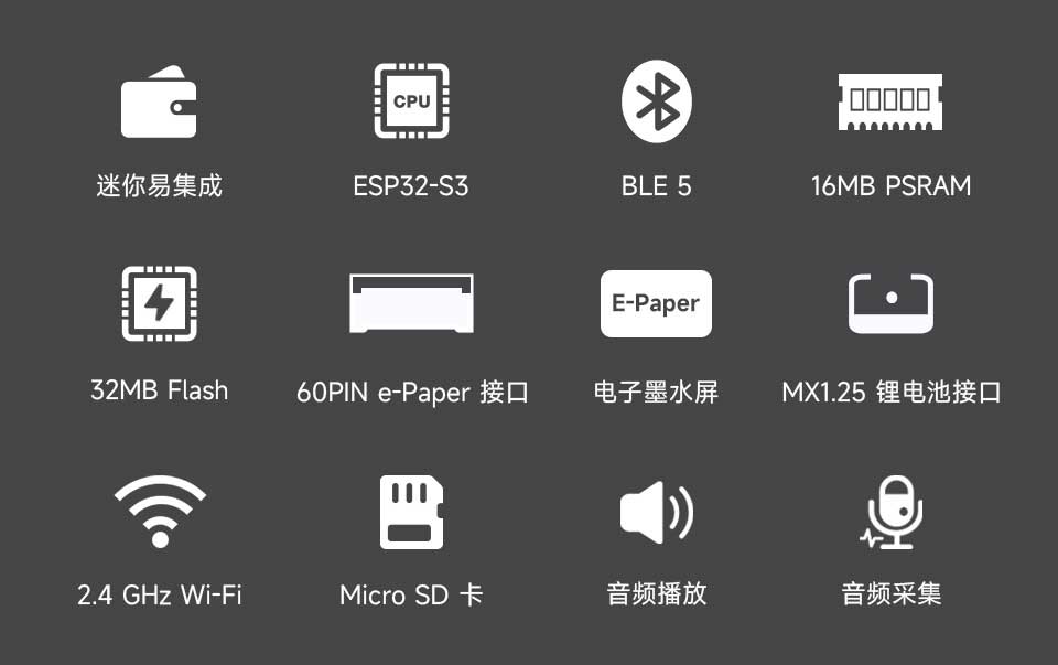 驱动板体积小巧,是一款搭载 60PIN 墨水屏接口的微控制器开发板。在硬件上,采用 ESP32-S3-WROOM-2-N32R16V 模组,其搭载有 Xtensa 32 位 LX7 双核处理器,主频高达 240MHz,内置 512KB SRAM (TCM),16MB PSRAM 和 32MB Flash,支持 Wi-Fi 与 BLE 双模通信;集成 Micro SD 卡槽、低功耗音频编解码芯片电路,高效充放电管理芯片 ETA6098 和 MX1.25 锂电池接口,板载 CH343 串口和 CH334 USB HUB 双芯片,可通过一个 Type-C 接口同时进行 USB 和 UART 的使用和开发,外部引出多个排针引脚接口,可兼容扩展多种外围设备,使用方便。