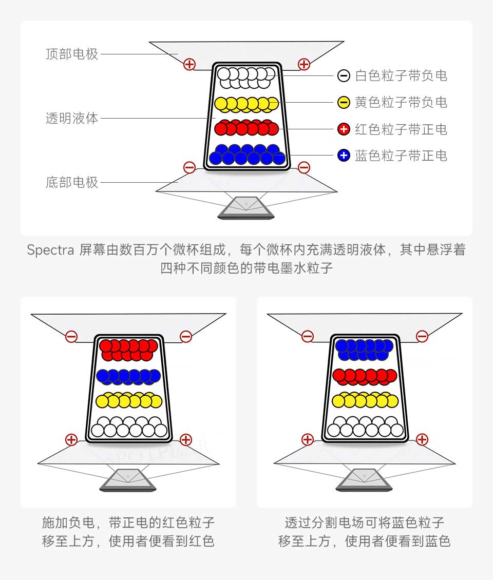E Ink Spectra 6 是一款新推出的全彩电子纸技术,该技术以其卓越的色彩表现、高分辨率和出色的对比度,为电子纸领域注入了新的活力。红黄蓝三色基,为色彩显示提供了更多可能。高对比度、高饱和度使图片显示更清晰,色彩更明亮。