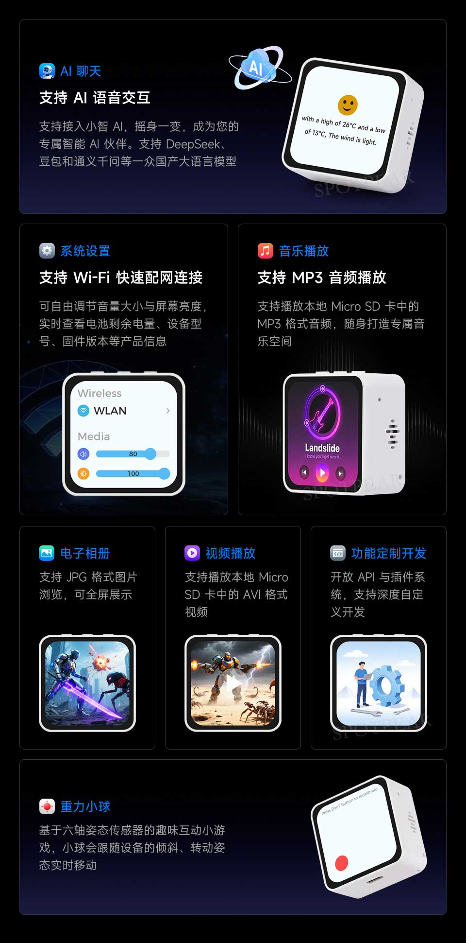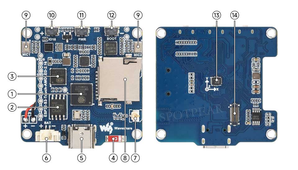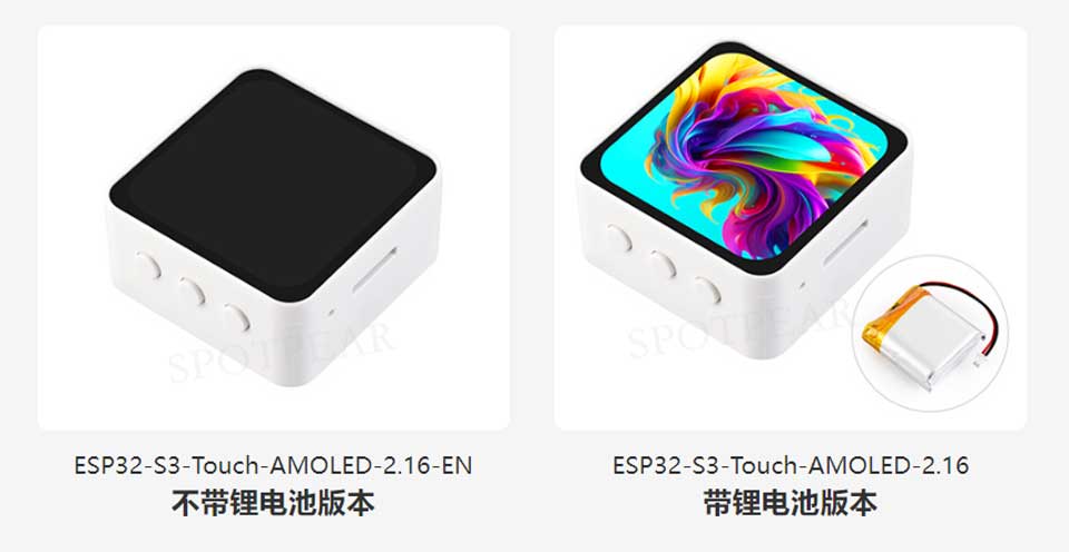 本产品是一款微雪 (Waveshare) 设计的高性能、高集成的微控制器开发板。在较小的板型下,板载了 2.16 英寸电容高清 AMOLED 屏、高度集成的电源管理芯片、六轴传感器 (三轴加速度计与三轴陀螺仪)、RTC、低功耗音频编解码芯片和回声消除电路等外设,方便开发并嵌入到产品中。