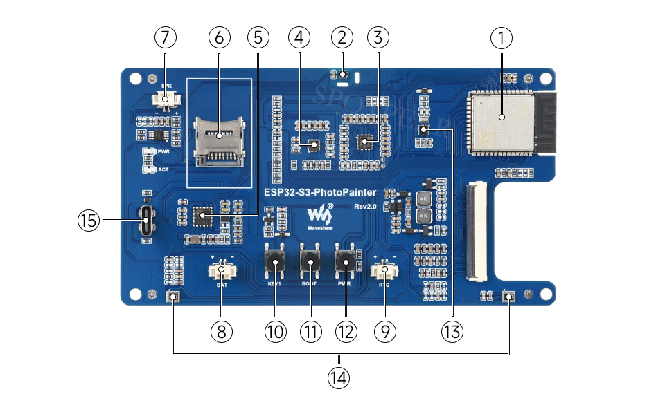 本产品是一款墨水屏 AIoT 相框,板载 ESP32-S3 微控制器,支持 Wi-Fi 与 BLE 双模通信。搭载 7.3 英寸电子墨水屏,功耗极低,适合便携设备及长续航场景。集成 RTC 实时时钟、SHTC3 温湿度传感器、microSD 卡槽、低功耗音频编解码芯片电路以及锂电池充放电管理电路。