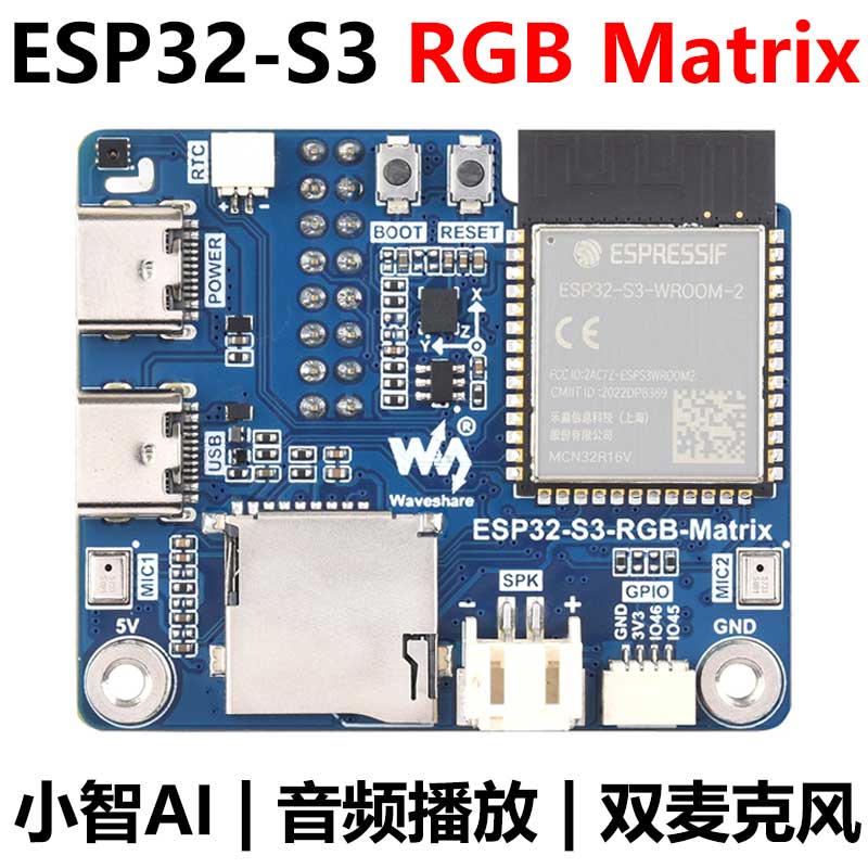 本产品由微雪(Waveshare)设计,是一款高性能、高集成度的 LED 屏幕显示驱动板,适用于 HUB75 接口 RGB Matrix 显示及相关嵌入式应用。板载高性能微控制器及大容量 Flash,集成 RTC、IMU、Micro SD 卡槽、低功耗音频编解码芯片、双麦克风等丰富外设资源,同时预留 USB、UART、I2C 及 GPIO 等接口,具备良好的扩展能力,方便用户快速开发并嵌入到实际产品中。