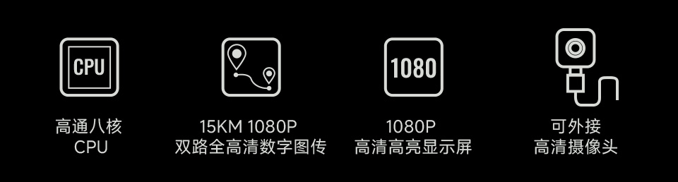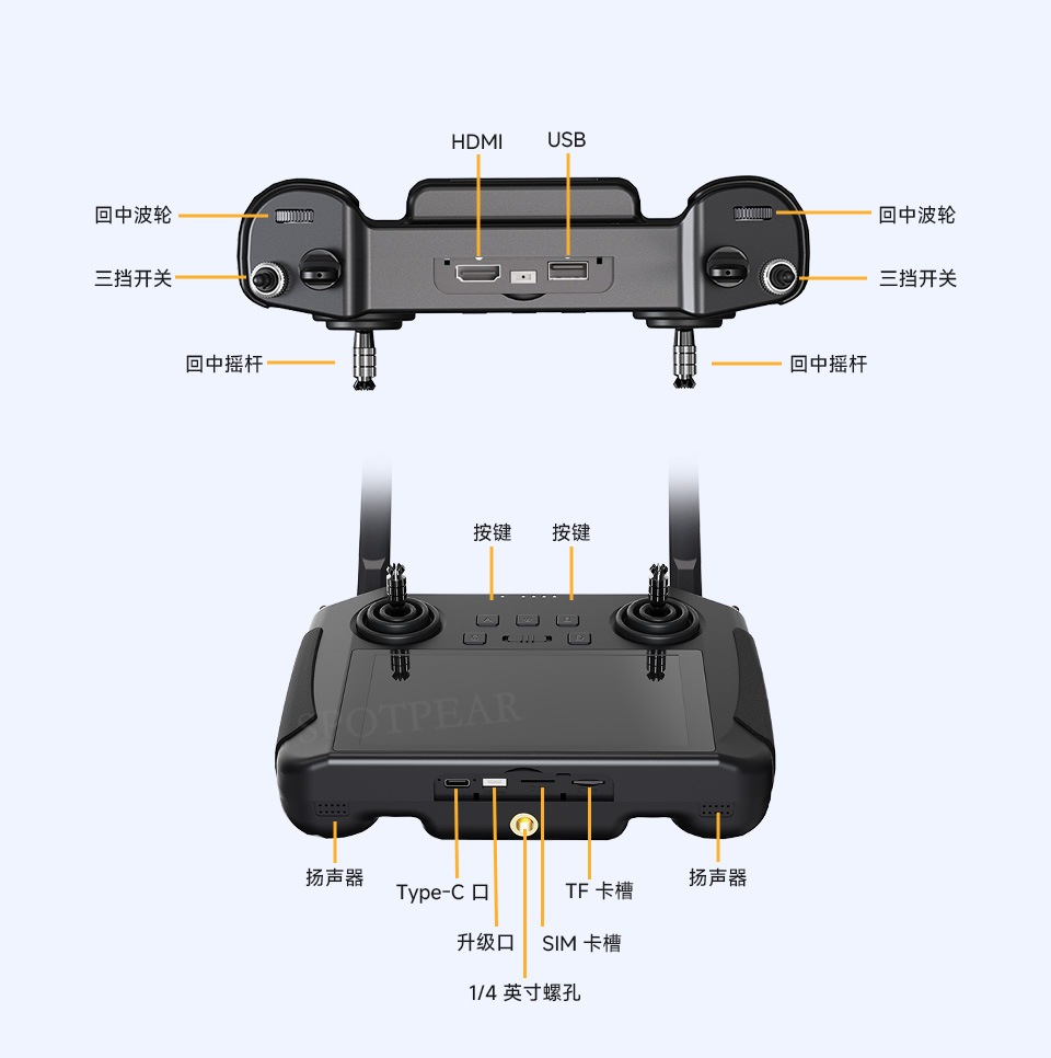 功能接口 | 充电:Type-C 固件升级:DATA (4PIN) 移动网络:SIM 卡槽 外置存储:TF 卡槽 三脚架固定:1/4 螺纹孔 视频输出:标准 HDMI 外置 RTK:DATA (4PIN) 外接 U 盘:USB-A |
