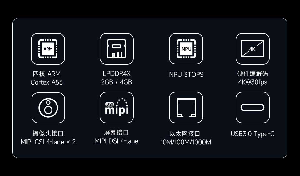 | 视频输出 | 4-lane MIPI DSI (1920x1080@60fps) 接口 × 1 |