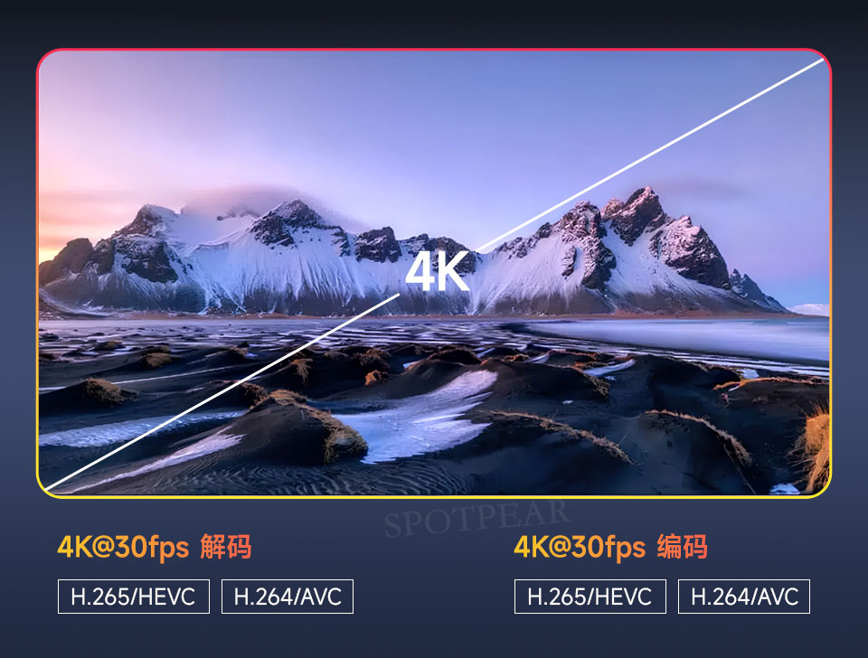 | 编解码 | 解码:4K@30fps (H.265/HEVC、H.264/AVC) 编码:4K@30fps (H.265/HEVC、H.264/AVC) |