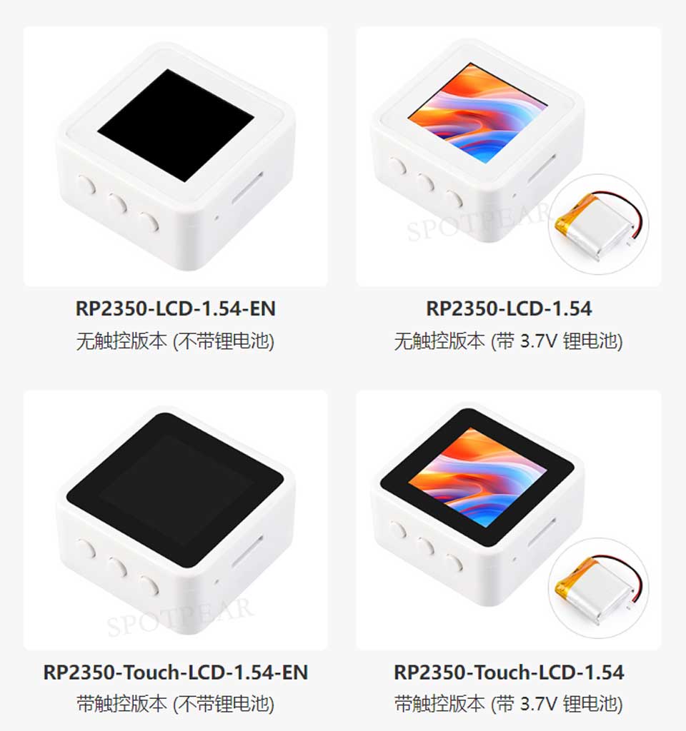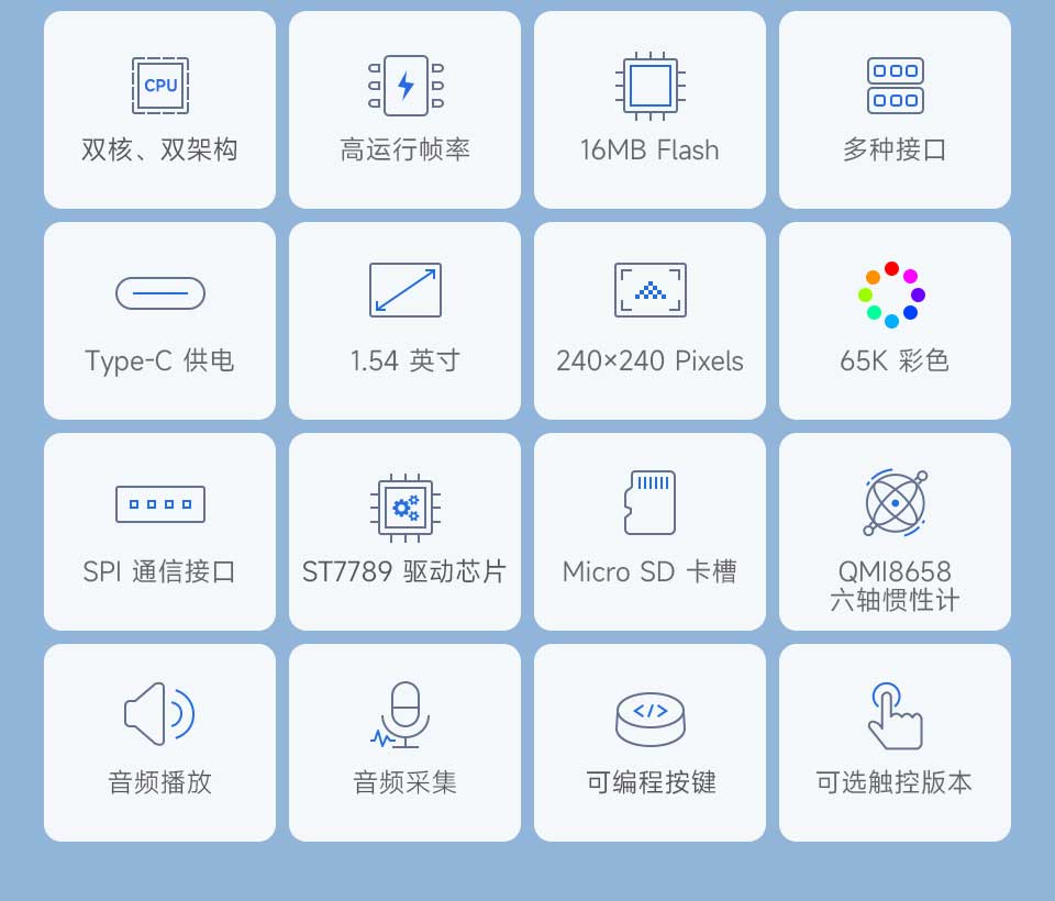 本产品是一款微雪 (Waveshare) 自主设计的高性能、高集成的微控制器开发板。集成大容量 Flash,板载了 1.54 英寸电容高清 LCD 屏、IMU、Micro SD 卡槽等外设,结合多种通讯接口,便于开发和集成到产品中。
