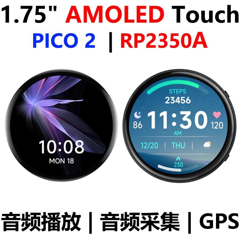 树莓派Pico 2 RP2350 1.75寸AMOLED圆形触摸显示屏QMI8658 6轴陀螺仪传感器GPS