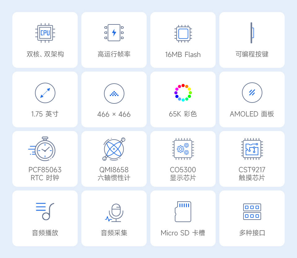本产品是一款微雪 (Waveshare) 设计的高性能、高集成的微控制器开发板。在较小的板型下,板载了 1.75 英寸电容高清 AMOLED 屏、高度集成的电源管理芯片、六轴传感器 (三轴加速度计与三轴陀螺仪)、RTC 和低功耗音频编解码芯片等外设,便于开发和集成到产品中。