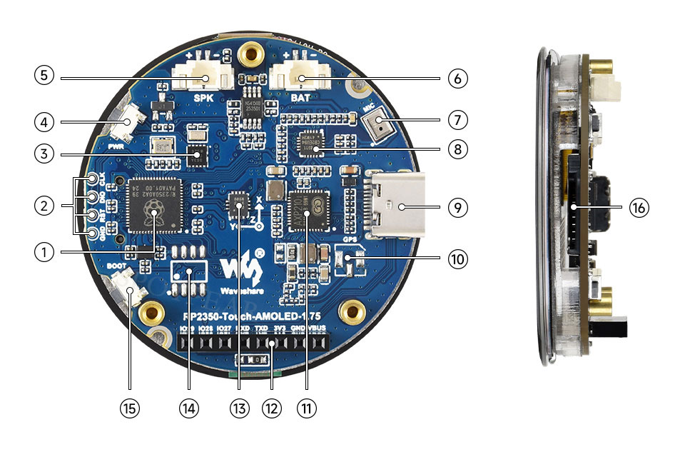 RP2350 1.75 英寸 AMOLED 屏开发板 466×466 分辨率 65K 彩色 双核双架构 板载加速度/陀螺仪 IMU 传感器