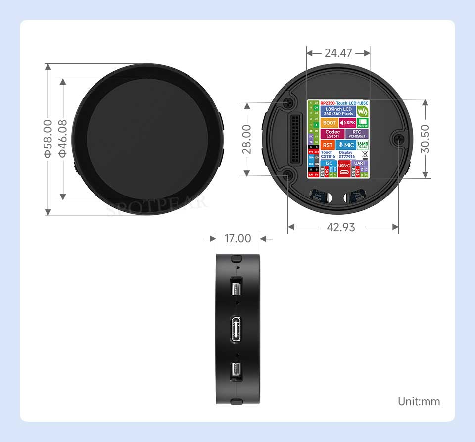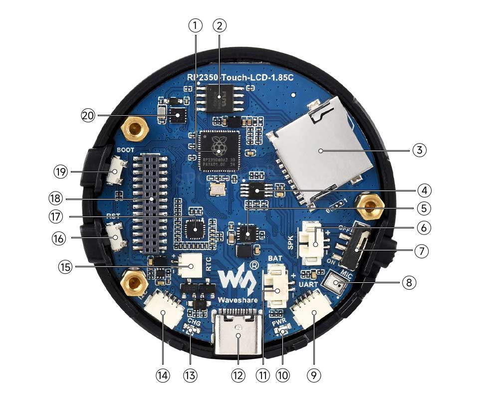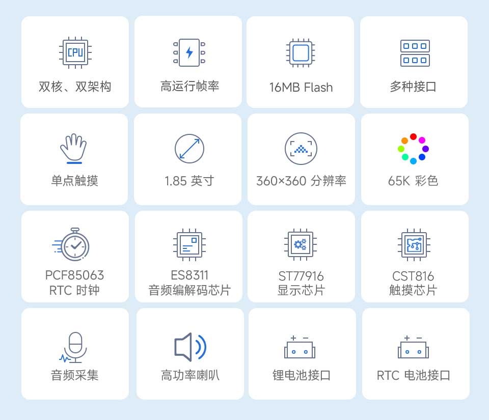 本产品是一款微雪 (Waveshare) 自主设计的高性能、高集成的微控制器开发板。在较小的板型下,板载了 1.85 英寸电容高清 IPS 屏、RTC、Micro SD 卡槽等外设,便于开发和集成到产品中。