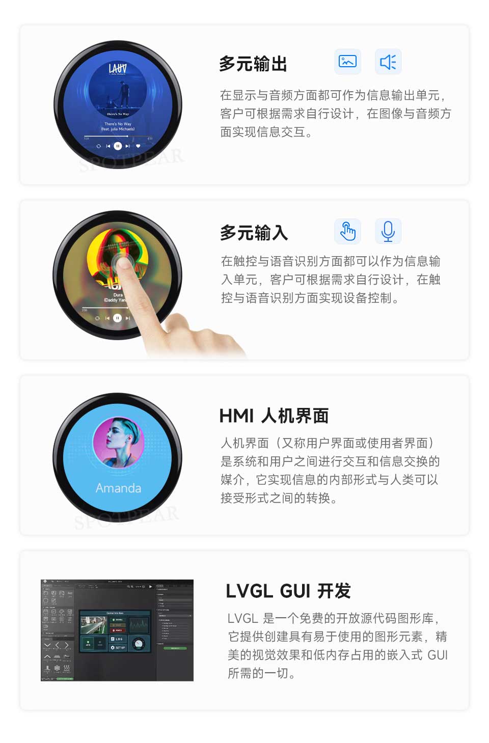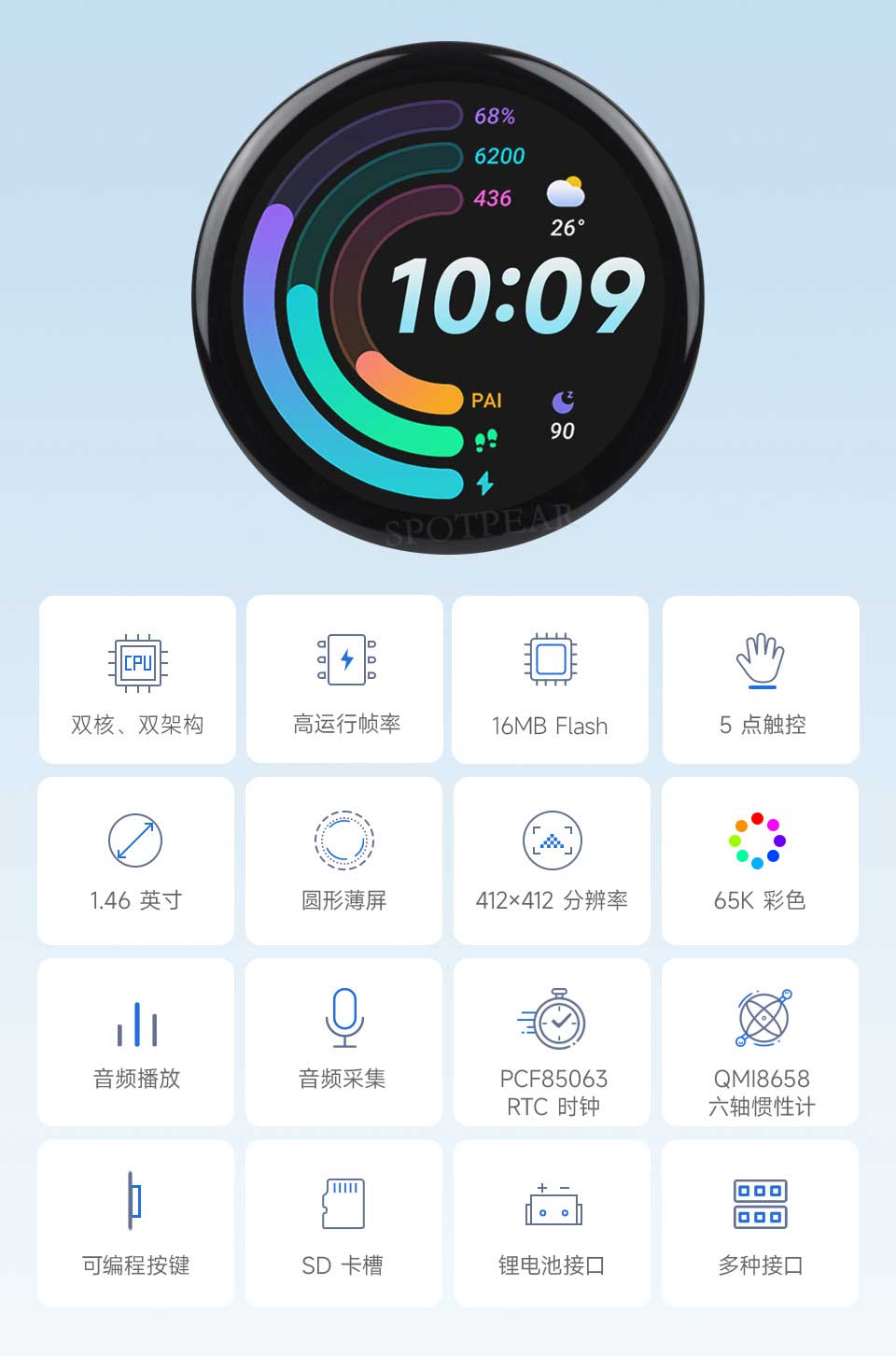 • 板载 1.46 英寸 LCD 屏,分辨率 412 × 412,65K 彩色