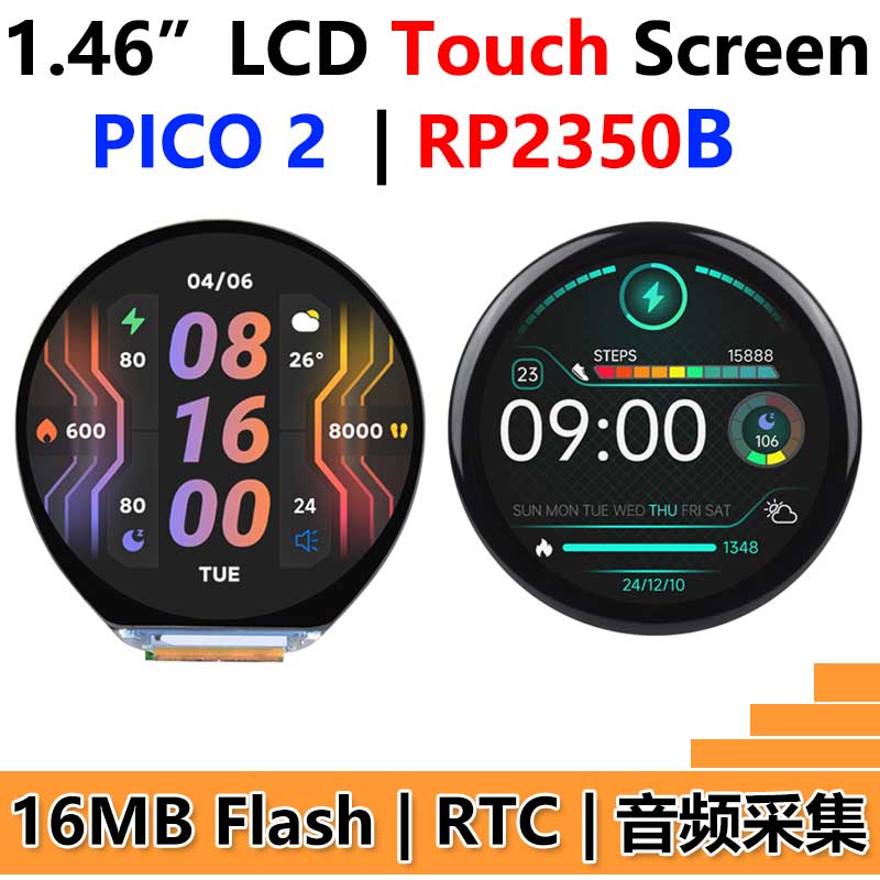 本产品是一款微雪 (Waveshare) 自主设计的高性能、高集成的微控制器开发板。在较小的板型下,板载了 1.46 英寸电容高清 IPS 屏、RTC、六轴传感器 (三轴加速度计与三轴陀螺仪)、Micro SD 卡槽等外设,便于开发和集成到产品中。