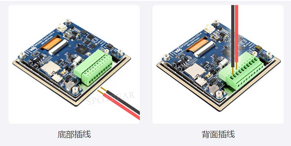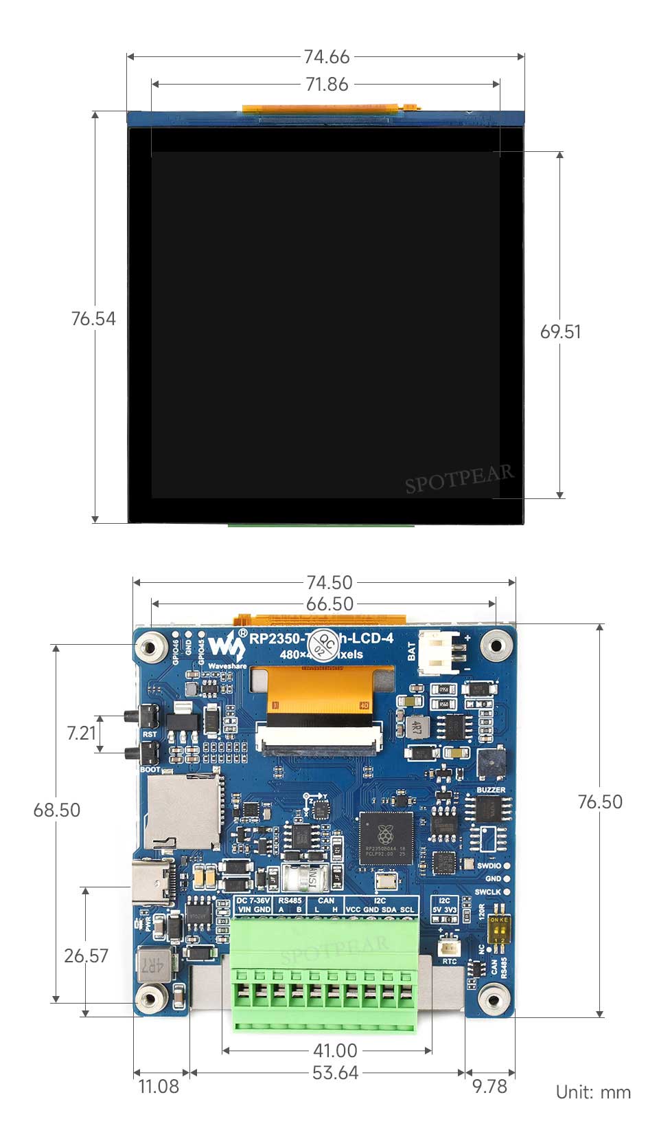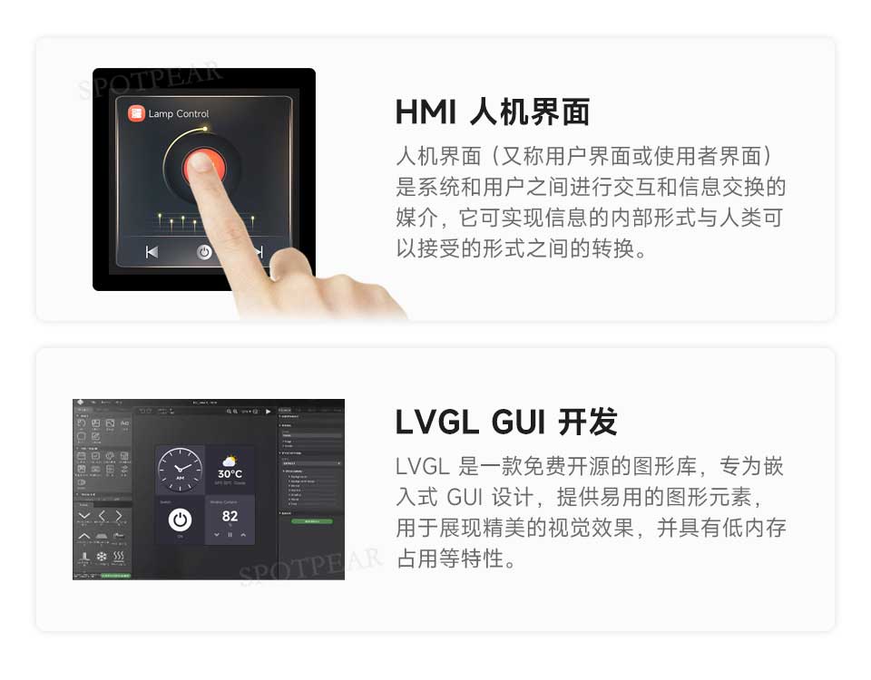 • 板载 4 英寸 LCD 屏,480 × 480 分辨率,65K 彩色,能清晰地显示彩色图片