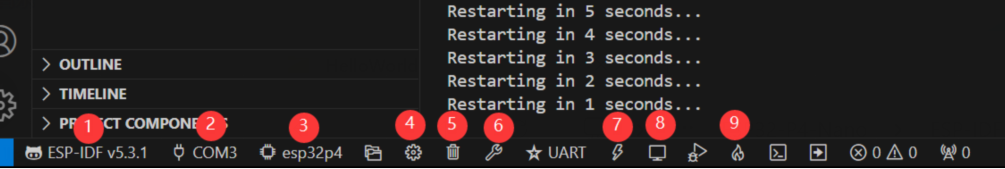 打开 ESP-IDF 工程时,底部会自动加载环境。对于 ESP32-P4-WIFI6-Touch-LCD-4.3 开发,底部工具栏非常重要,如图所示: