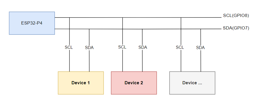 I2C 是一个较常用的串行通信总线,它可以通过两条线进行通信,一根数据线(SDA, Serial Data)和一根时钟线(SCL, Serial Clock),并支持多主多从模式。在 ESP32-P4 上一共有 2 个 I2C 总线接口,芯片内部通过 GPIO 交换矩阵可配置使用任意 GPIO 管脚,这个特性可以让我们自由的使用任意 GPIO 作为 I2C 的引脚控制,当然 ESP32-P4 I2C 支持 Slave、Master 模式,以下主要使用 I2C 主机(Master)模式,用于 ESP32-P4 启动通信、控制并向从设备(可以是任何 I2C 接口的传感器)发送数据请求或接收数据。 ESP32-P4-WIFI6-Touch-LCD-4.3 的 I2C 引脚默认使用 SCL(GPIO8)、SDA(GPIO7)