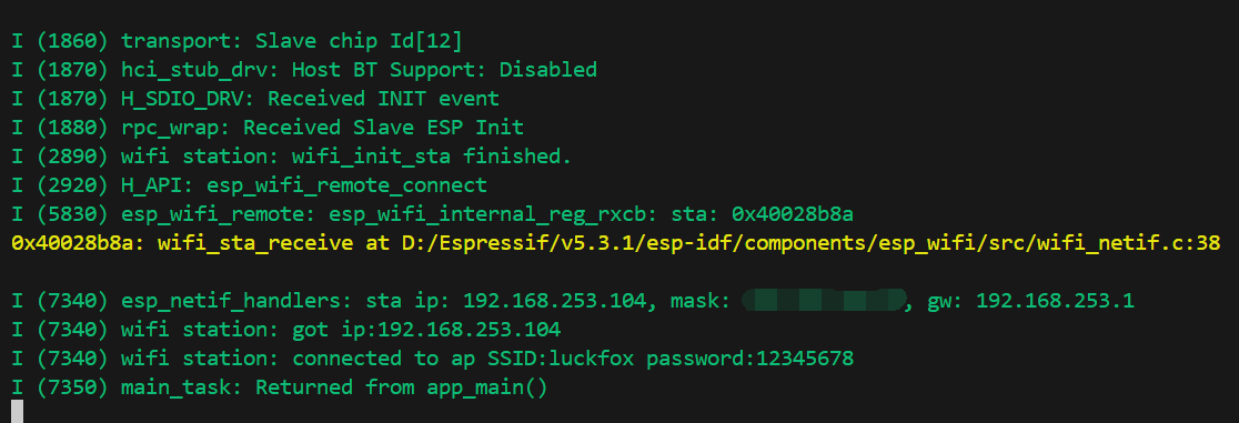 接下来可以直接通过点击 编译、烧录、监视,完成后会在终端查看到如下结果,此时 ESP32-P4-WIFI6-Touch-LCD-4.3 已经接入 WIFI 并且联网了: