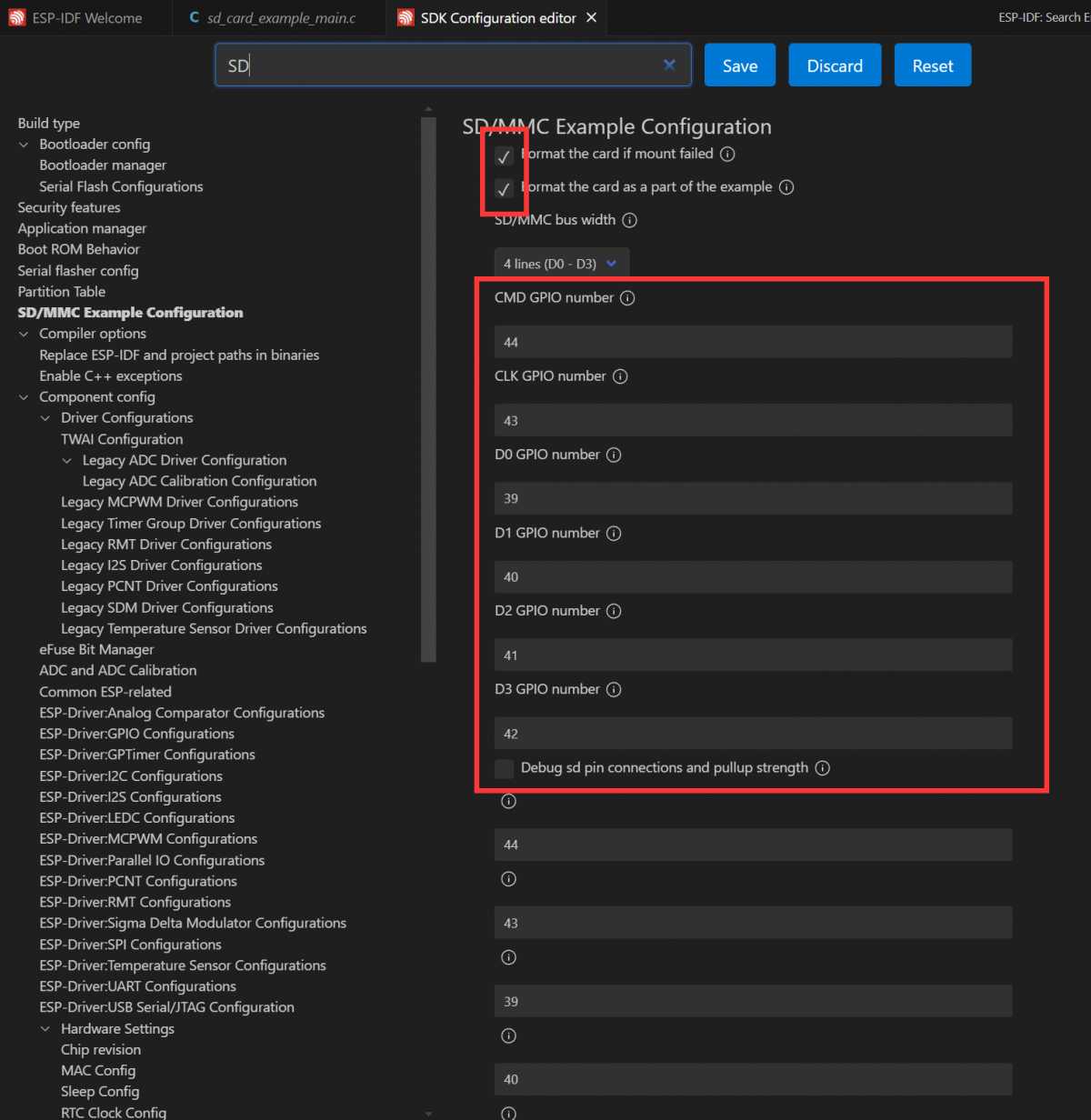 打开 sdmmc 工程,选择好 COM 口和芯片型号,因为 demo 工程将引脚定义为宏,所以需要进行配置,当然也可以直接填入引脚数值。点击 进入设置,这里会打开一个新的标签:SDK Configuration editor 也就是 menuconfig,我们直接在搜索栏中搜索 sd,看到此时内容已经检索,并且示例配置已经配置,勾选上默认初始化且默认创建示例文件: