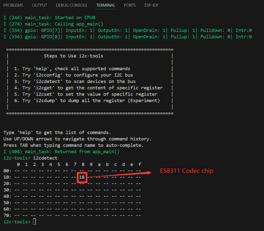 接下来可以直接通过点击 编译、烧录、监视,完成后会在终端查看到命令菜单,当我们执行 i2cdetect 后,会打印出所有的 I2C 地址,如果有设备存在则会显示数字(I2C 地址 18 设备是板载的 ES8311 Codec 音频芯片,此芯片会在 I2S 部分详细说明),如图: