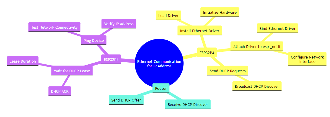 此示例演示了 Ethernet driver 与 esp_netif 的基本用法。 Ethernet driver 的初始化包含在该项目的单独子组件中,以清楚地区分驱动程序的初始化和 esp_netif 初始化。该示例的工作流程如下:
