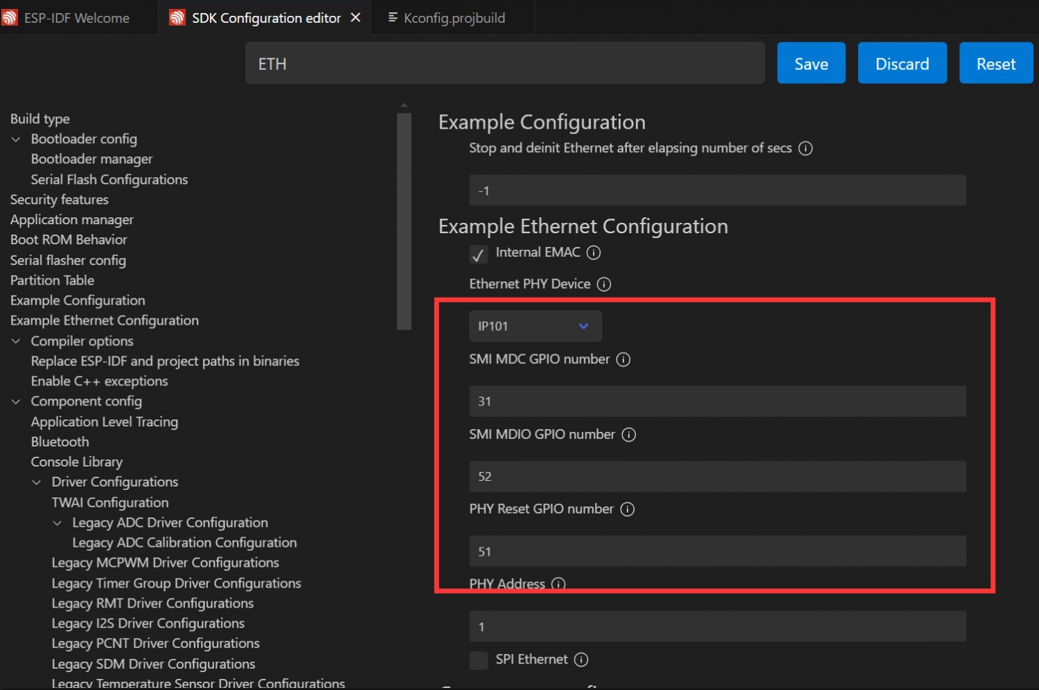 TXD[1:0]:发送数据线,由 GPIO34、GPIO35 控制RXD[1:0]:接收数据线,由 GPIO30、GPIO29 控制TX_EN:发送启用信号,由 GPIO49 控制CRS_DV:载波检测和数据有效信号,由 GPIO28 控制REF_CLK:参考时钟,由 GPIO50 控制,50MHz 由 PHY 外侧连接的 25 MHz 无源晶振经过倍频产生MDIO 和 MDC:用于以太网的管理数据接口(控制和配置 PHY),由 GPIO52、GPIO31 控制RESET:控制 IP101GRI 复位,由 GPIO51 控制打开 ethernetbasic 工程,选择好 COM 口和芯片型号,点击 进入设置,这里会打开一个新的标签:SDK Configuration editor 也就是 menuconfig,我们直接在搜索栏中搜索 ETH,看到此时内容已经检索,将下图中参数与之对应,即可: