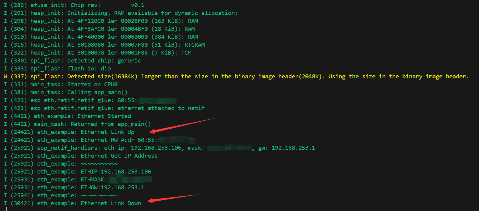 接下来可以直接通过点击 编译、烧录、监视,完成后会在终端查看到程序启动,插入网线后可以获取到 IP,拔掉网线后断开动作,如图: