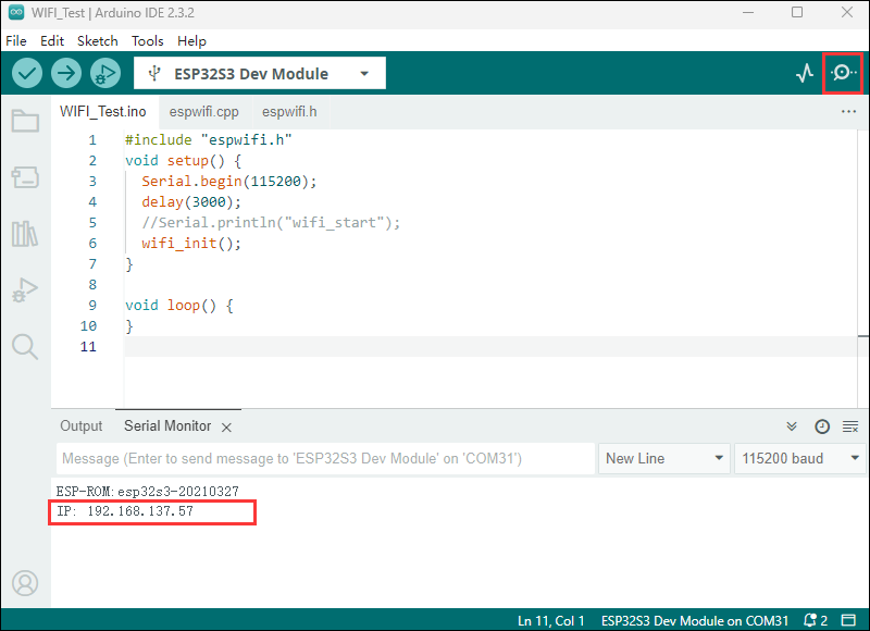 烧录完程序,打开串口终端,如果设备连接成功热点之后,会输出所获取的IP地址,如图: