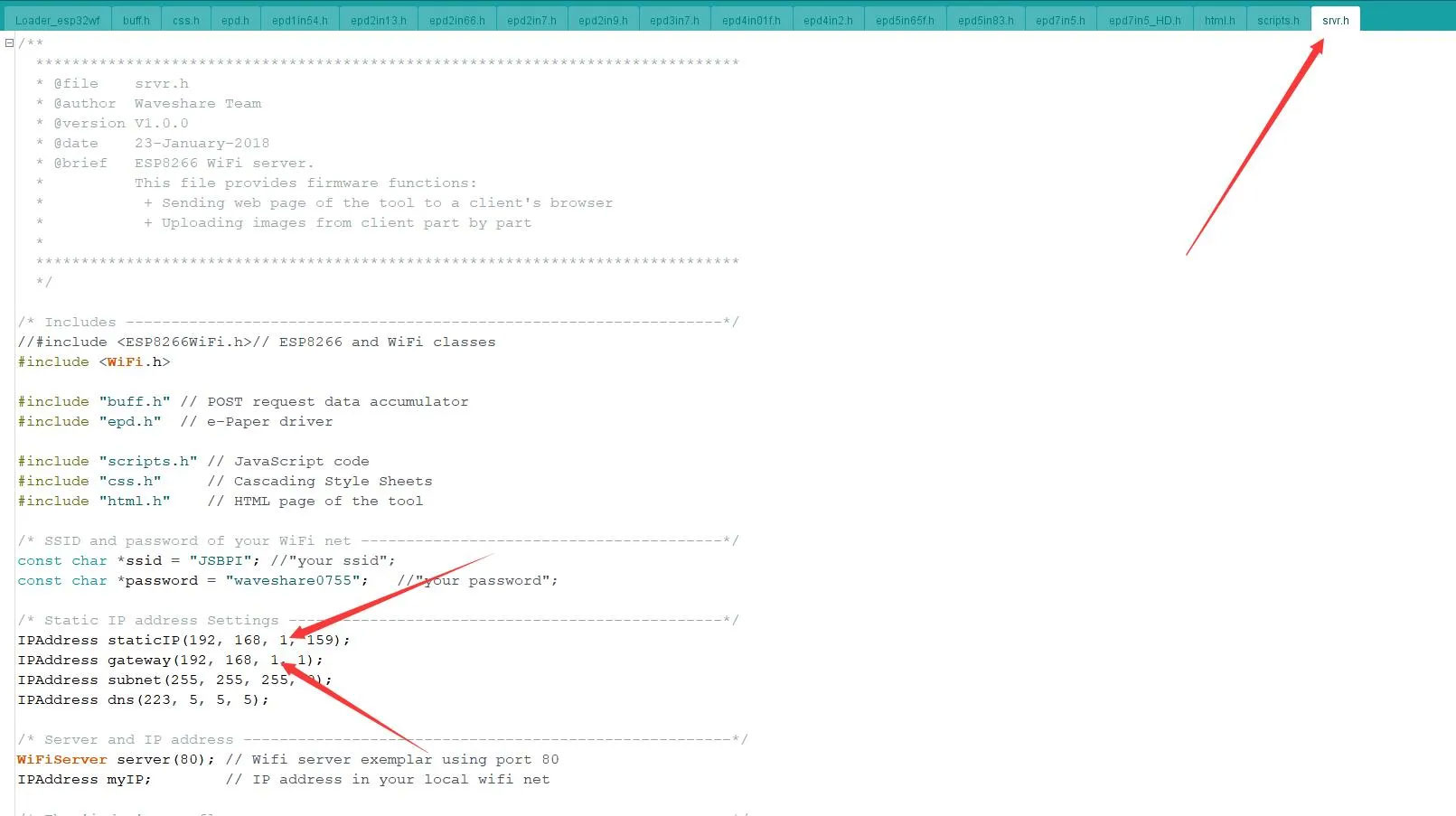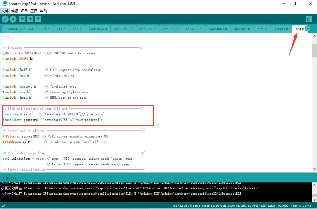 打开srvr.h文件,将ssid和password改成实际使用的 WiFi 用户名和密码