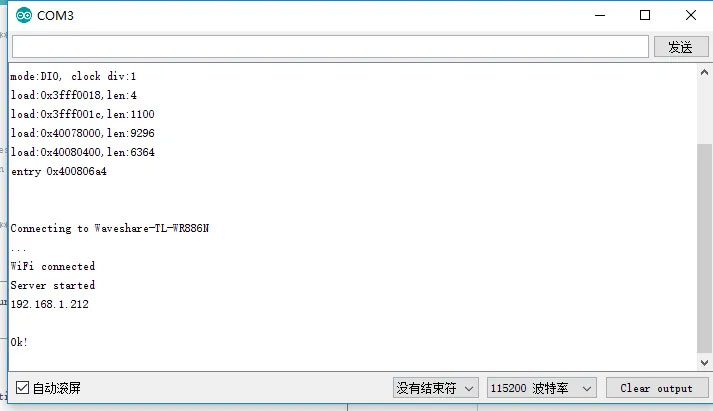 打开串口监视器,设置波特率为 115200,可以看到串口将 ESP32 驱动板的 IP 地址打印出来: