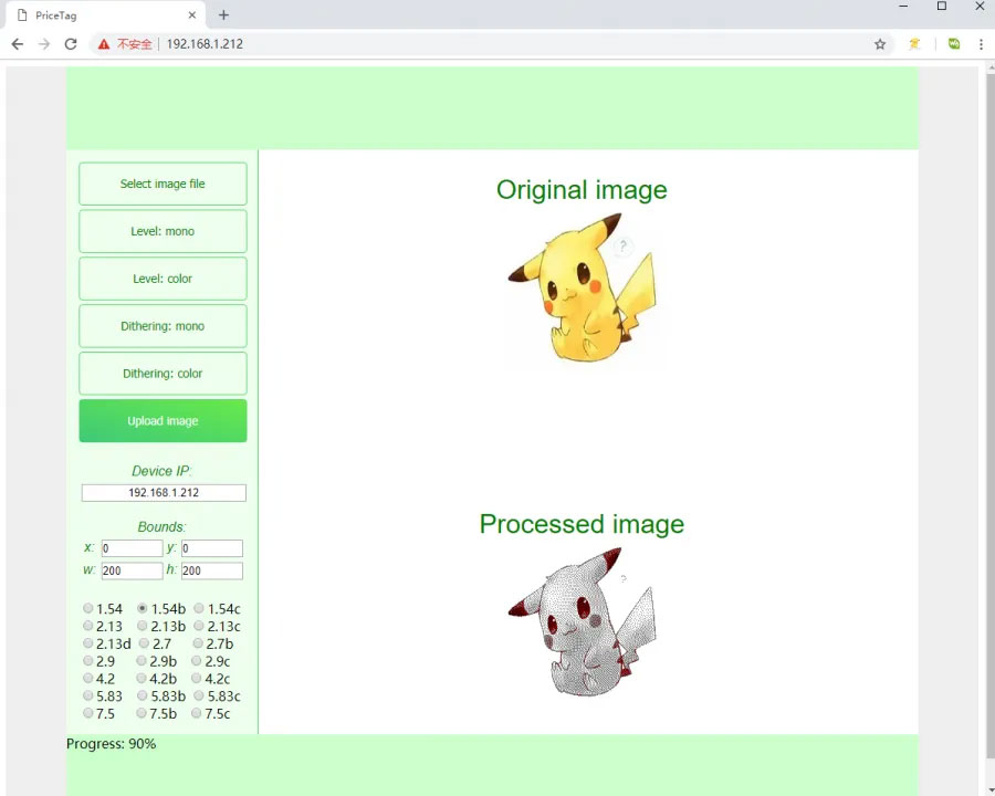 Select Image file: 点击在电脑或者手机里面选择一张图片Level: mono: 黑白色阶图像处理算法Level: color: 多色色阶图像处理算法(只对多色屏幕生效)Dithering: mono: 黑色抖动图像处理算法Dithering: color: 多色抖动图像处理算法(只对多色屏幕生效)Update image: 上传图像如果修改了 x 和 y 的指的话,需要重新点击一下处理算法生成新的图像