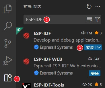 在搜索框中输入 ESP-IDF,找到 ESP-IDF 扩展并点击安装。
