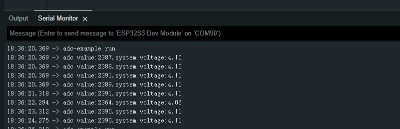 adc_bsp_init(void):初始化 ADC1,包括创建 ADC 单次触发单元并配置 ADC1 的通道 7。adc_get_value(float *value,int *data):读取 ADC1 通道 7 的值,并根据参考电压和分辨率计算出对应的电压值存储在传入的指针指向的位置,如果读取失败则存储 0。adc_example(void* parameter):初始化 ADC1 后,创建一个 ADC 任务,该任务每隔 1 秒读取一次 ADC 的值,通过读取的 ADC 原始值计算出系统的电压。【运行效果】