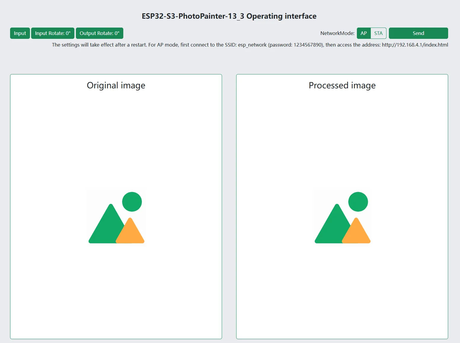 SSID:esp_network(密码:1234567890),然后访问地址:http://192.168.4.1/index.htmlhttp://esp32-s3-photopainter-13_3.local/index.htmlboot 按键进入模式选择,单击 boot 按键三次,然后再长按 boot 按键即可进入该模式config.txt 文件里面相关配置如下: