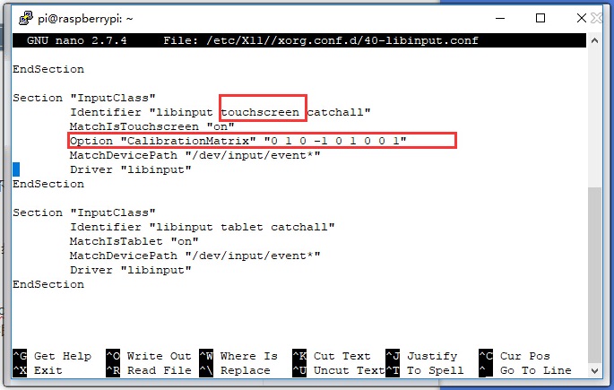 #找到 touchscreen的部分,在里面添加对应的旋转角度指令,然后保存即可 #90°Right触摸旋转: Option "CalibrationMatrix" "0 1 0 -1 0 1 0 0 1" #180° Inverted触摸旋转: #Option "CalibrationMatrix" "-1 0 1 0 -1 1 0 0 1" #270° Left旋转: #Option "CalibrationMatrix" "0 -1 1 1 0 0 0 0 1" 类似下图位置: