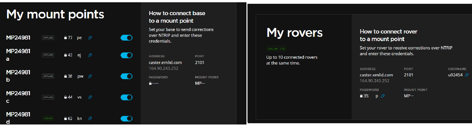 将上图的My mount points 配置给基站,My rovers 参数配置给流动站