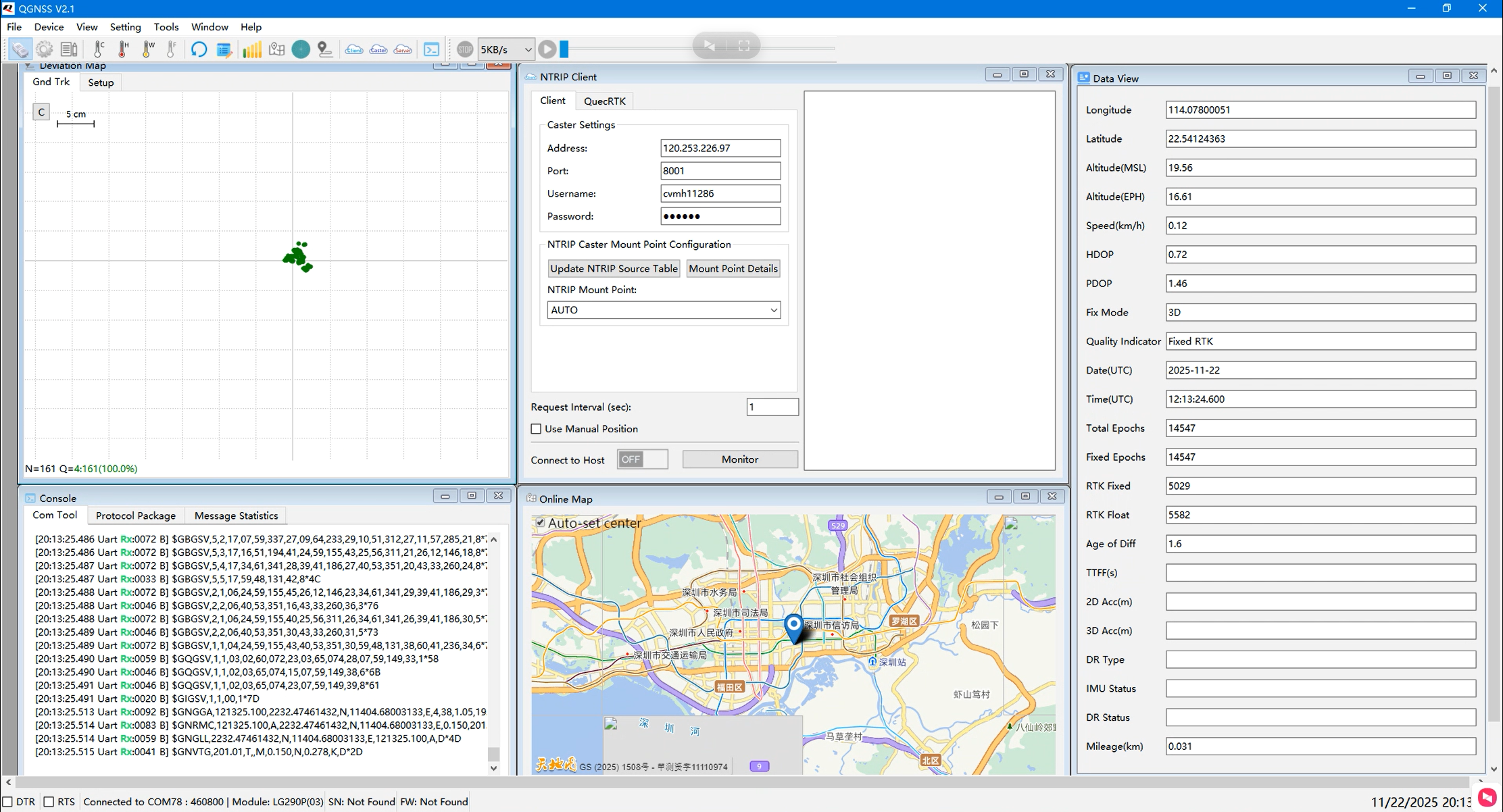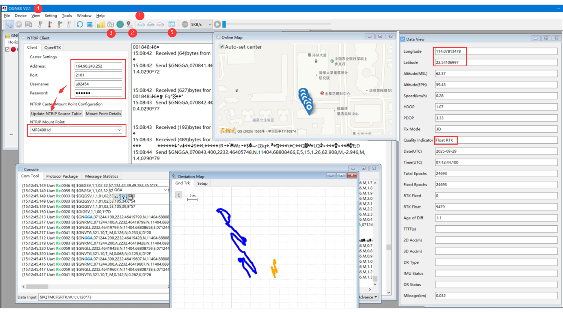 等2-15分钟,待右侧Data View窗口出现经纬度和Float RTK 提示,实现RTK 定位,9️⃣打开偏差图,可以看到定位精度